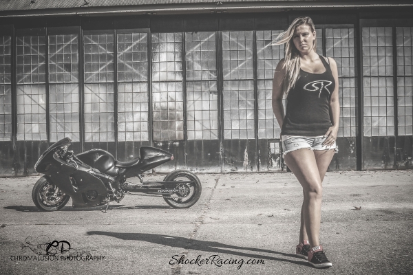 The Columbia, South Carolina speed junkie has been around cars and racing her whole life. Ruth tells us her parents built show and race cars as she was growing up. Fast forward to present day, Ruth spends much of her free time with her husband at the track racing her 2002 Hayabusa and 2007 GSXR 1000. In fact, they actually got married at Carolina Dragway!!! Both of these bikes have been set up for drag racing with nitrous and plenty of go fast goodies!